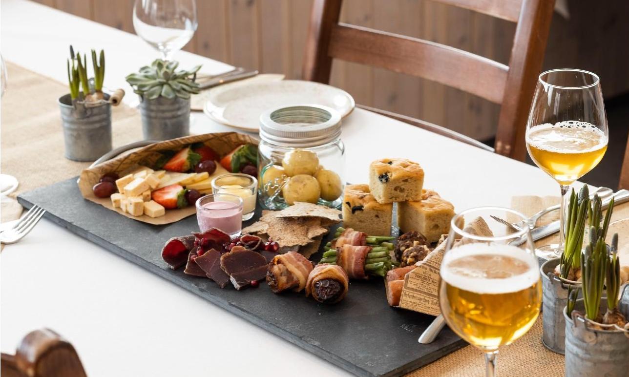 Hjemmelagde kjøttboller med kjøtt fra Flatland, stekte lammepølse fra Tor Mølster Byggland i Øyfjell, ost fra LEGA, hjemme marinerte kyllingvingeklubber i honning og chilisaus, spinatlefseruller med hjemmelaget lakskrem, blandet salat, marinerte oliven, baconsurrede dadler, ovnsbakte poteter med hvitløk, timian og sitron, Vierli's populære foccacia brød med oliven og aioli.